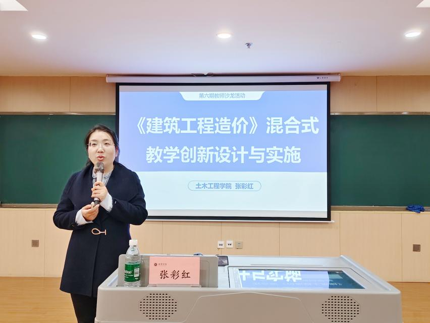 12月10日,第六期教学沙龙活动特邀土木工程学院张彩红副教授以“《建筑工程造价》混合式教学创新设计与实施”为主题展开讲述,张老师以丰富的参赛经历讲述了课程混合式教学设计创新的意义、做法和效果,最后给老师们分享了参赛时的注意事项及心态调整策略。