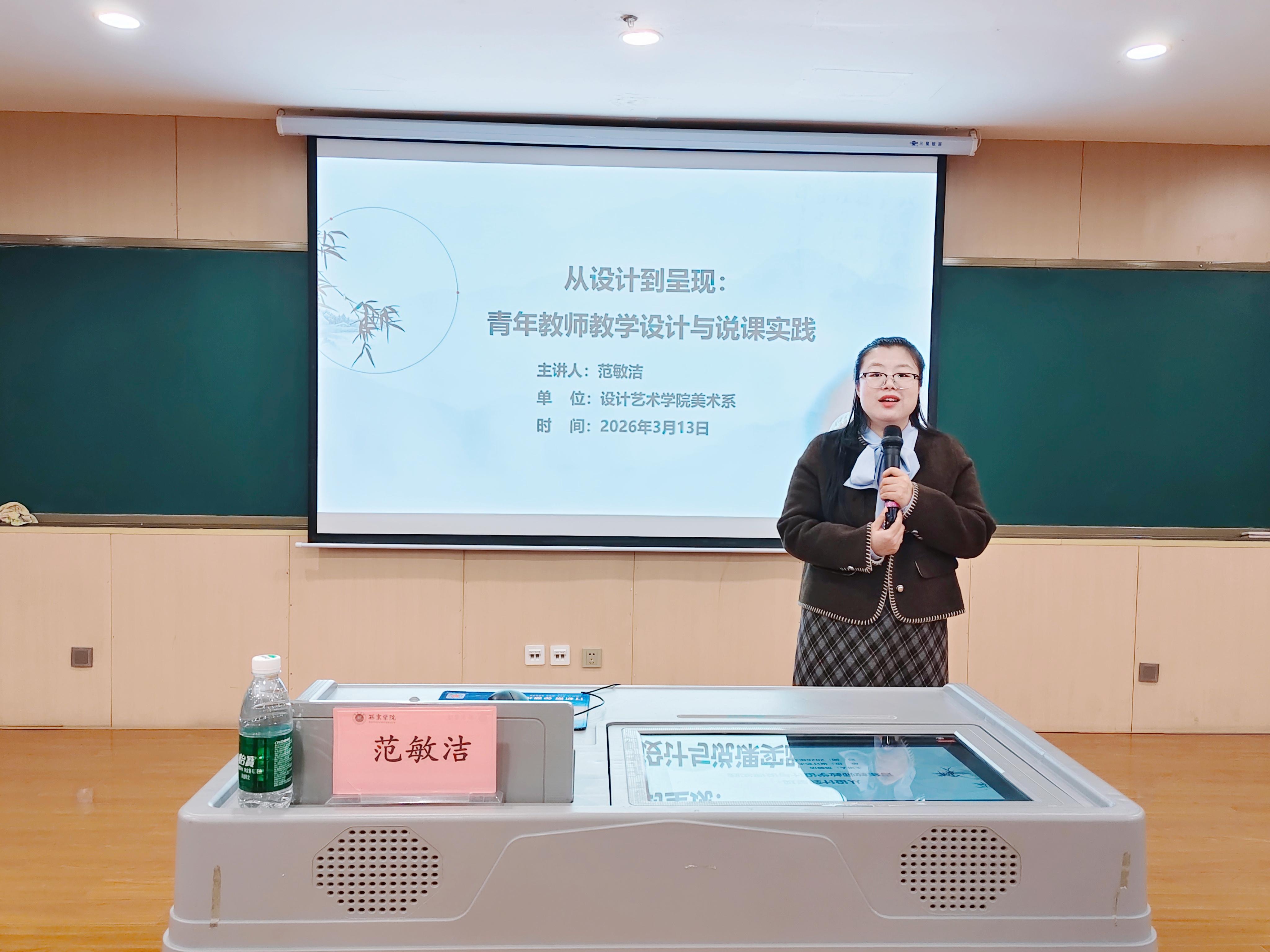 范敏洁老师以“从设计到呈现:青年教师教学设计与说课实践”为主题进行分享。结合参赛经历与教学成长轨迹,比对近三年课堂教学创新案例的变化,深入剖析教学痛点的演变与设计策略。她鼓励青年教师应当充分发挥学科优势,勇于课堂创新,扎实做好教学设计。